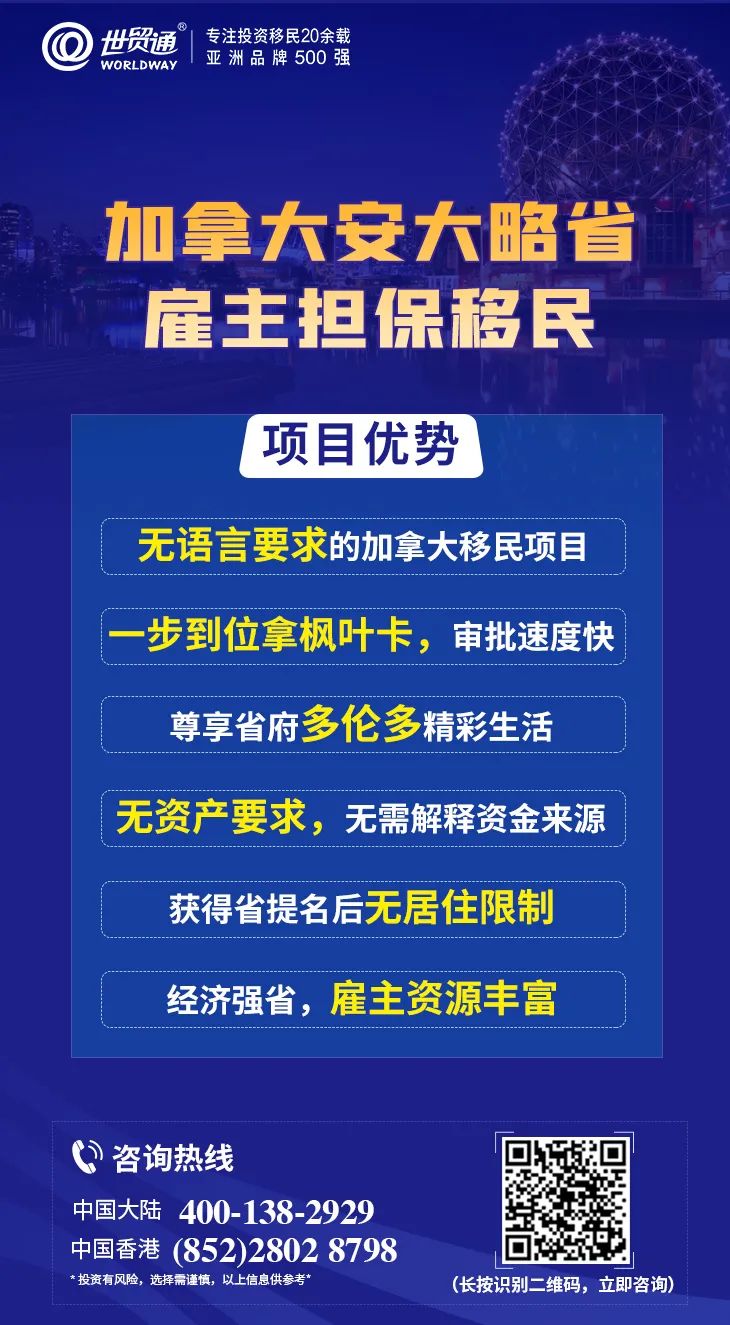 目前,加拿大安省雇主担保移民项目申请条件宽松,对语言没有任何要求,不需要考雅思,是投资者移民加拿大的热门选择。安省雇主担保EOI已经进行的前几轮抽选中,申请人的学历、语言仍然不计入打分系统。世贸通建议各位申请人宜尽快行动,抓住当前安省移民申请的红利期,早申请早受益,犹豫不断只会错失良机!抢占安省雇主担保移民EOI上线先机,低门槛低成本快速移民加拿大,就趁现在!