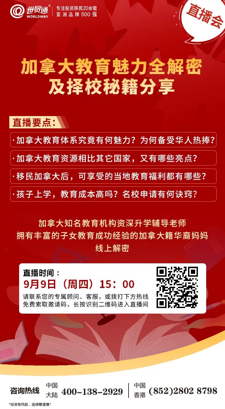 为帮助因子女教育而移民加拿大的人士,解决子女在加拿大入学、升学等问题,世贸通特邀加拿大知名教育机构升学辅导老师、拥有丰富的子女教育成功经验的加拿大籍华裔妈妈,亲身分享自己在加拿大的教育、生活、移民等方方面面的实用信息,请锁定“世贸通直播间”,别错过!
