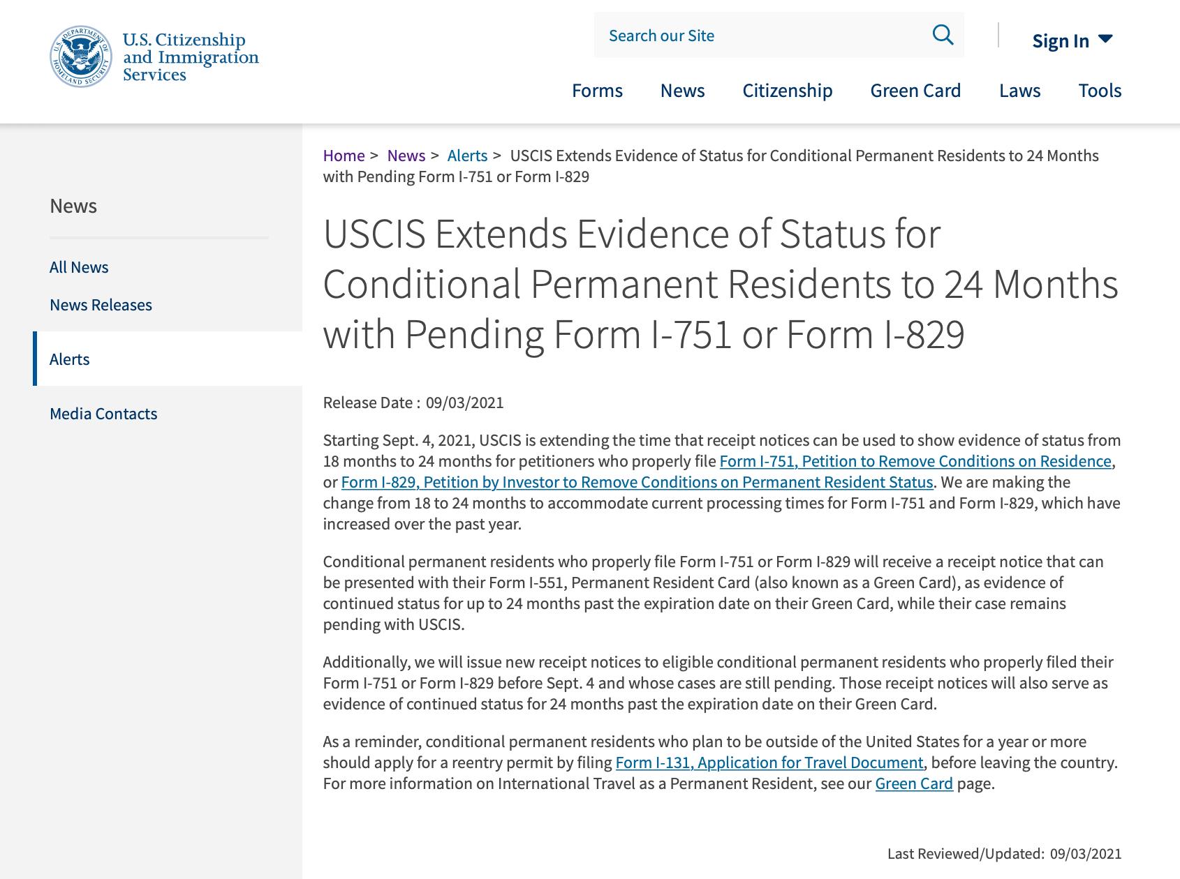近日,美国移民局(USCIS)宣布:自2021年9月4日起,临时绿卡有效期从18个月增加至24个月。此次延长的受益人有EB-5投资人中的I-829申请者和婚姻移民的I-751申请者。