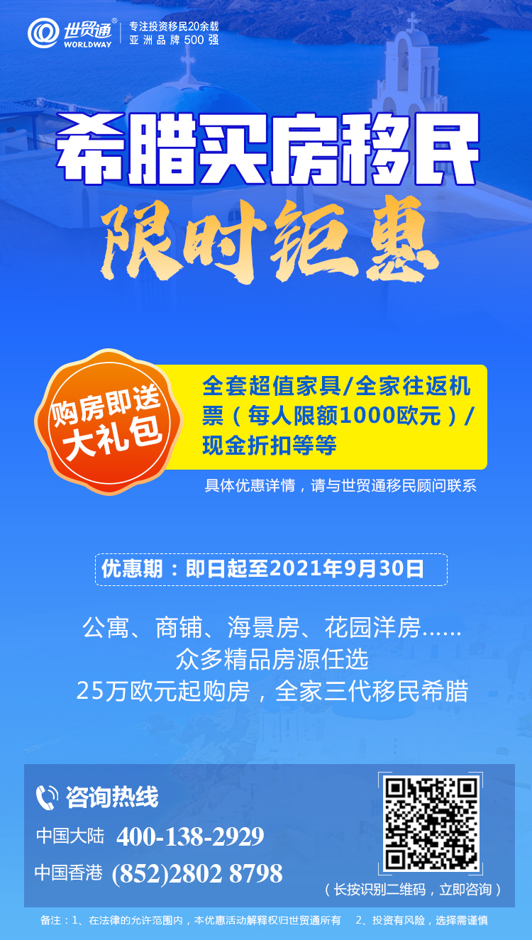 投资希腊正当时,多个热门房产任您选,现在购房即可获大礼包,有意者须及时把握好时机!更多详情,请拨打世贸通服务热线,中国大陆:400-138-2929 中国香港:(852) 2802 8798 。