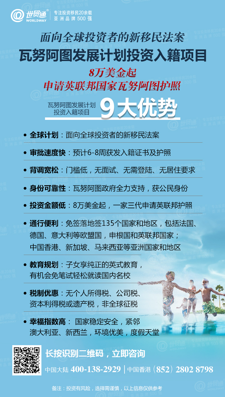 办理瓦努阿图移民项目,更多详情,请在评论区私信我们,或拨打世贸通服务热线,中国大陆:400-138-2929 ,中国香港:(852)2802 8798