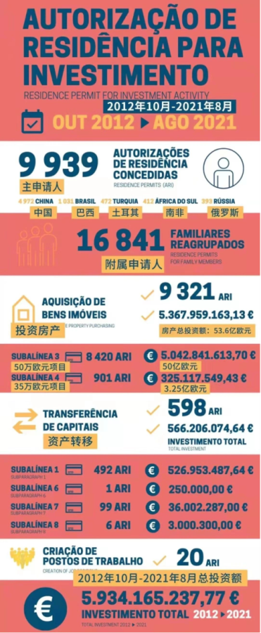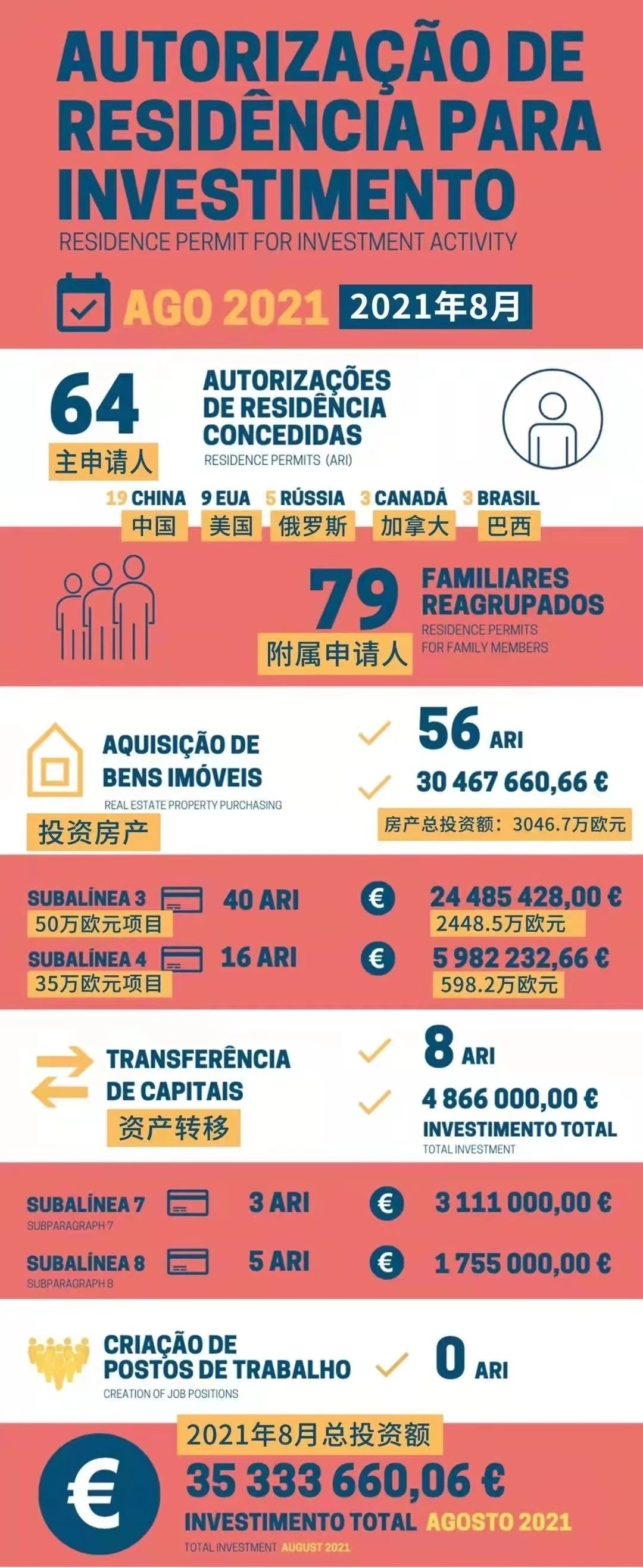 近日,葡萄牙移民局(SEF)公布了2021年8月份的黄金签证数据。2021年8月份,共计有64位主申请人和79位附属申请获批葡萄牙黄金签证,投资额为3533.3万欧元。其中,来自中国的申请人达到了19位,依旧排名第一。