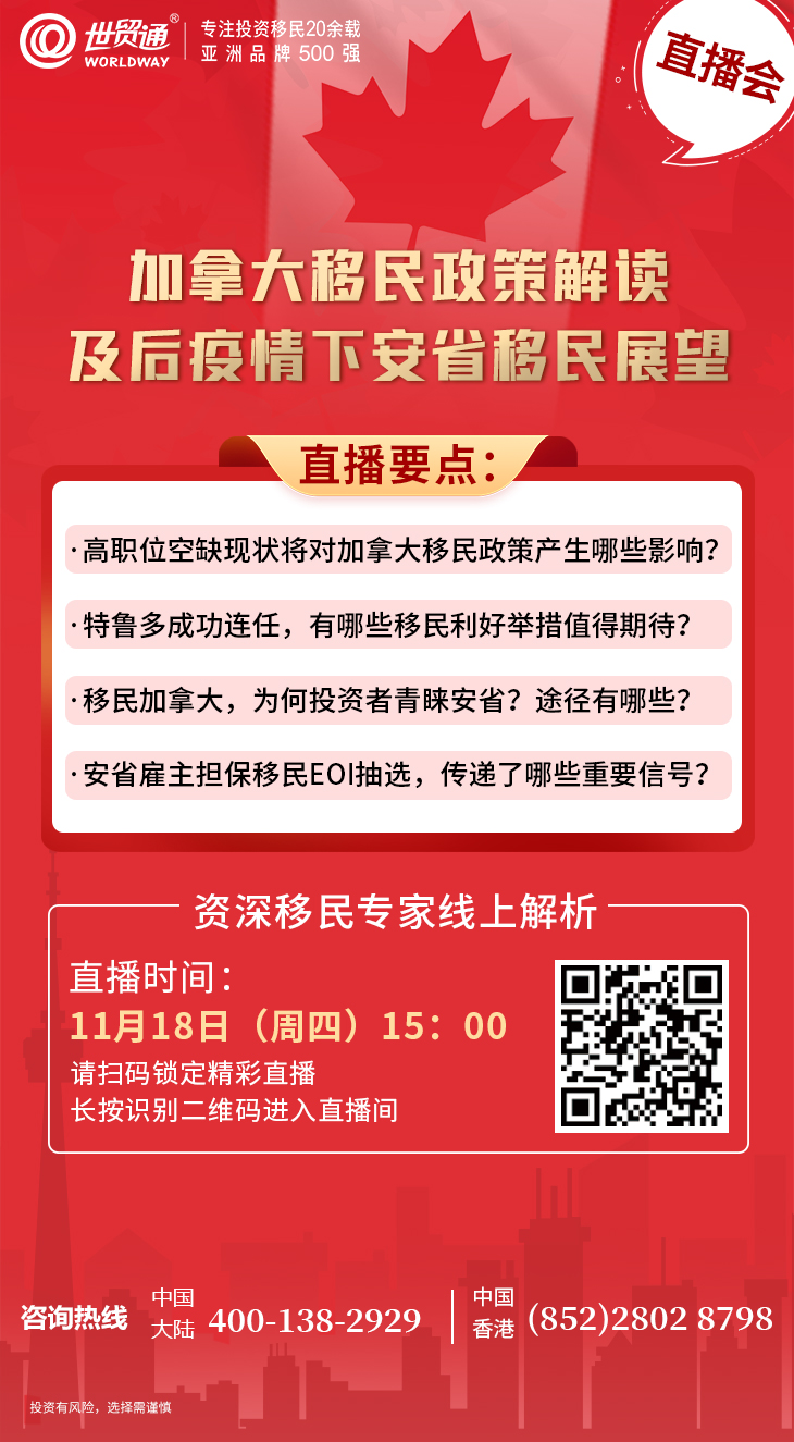 为帮助有意移民加拿大的申请人,抓住目前低门槛快速移民加拿大的上佳良机,世贸通特邀加拿大籍华人、资深加拿大移民专家,在线解读加拿大移民政策及后疫情下安省移民展望,干货满满,机会难得,请锁定“世贸通直播间”,别错过!