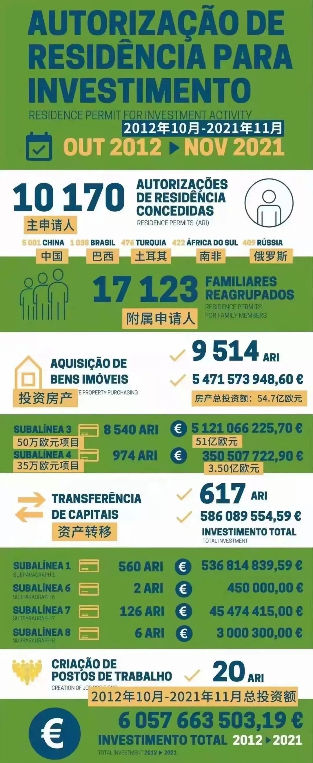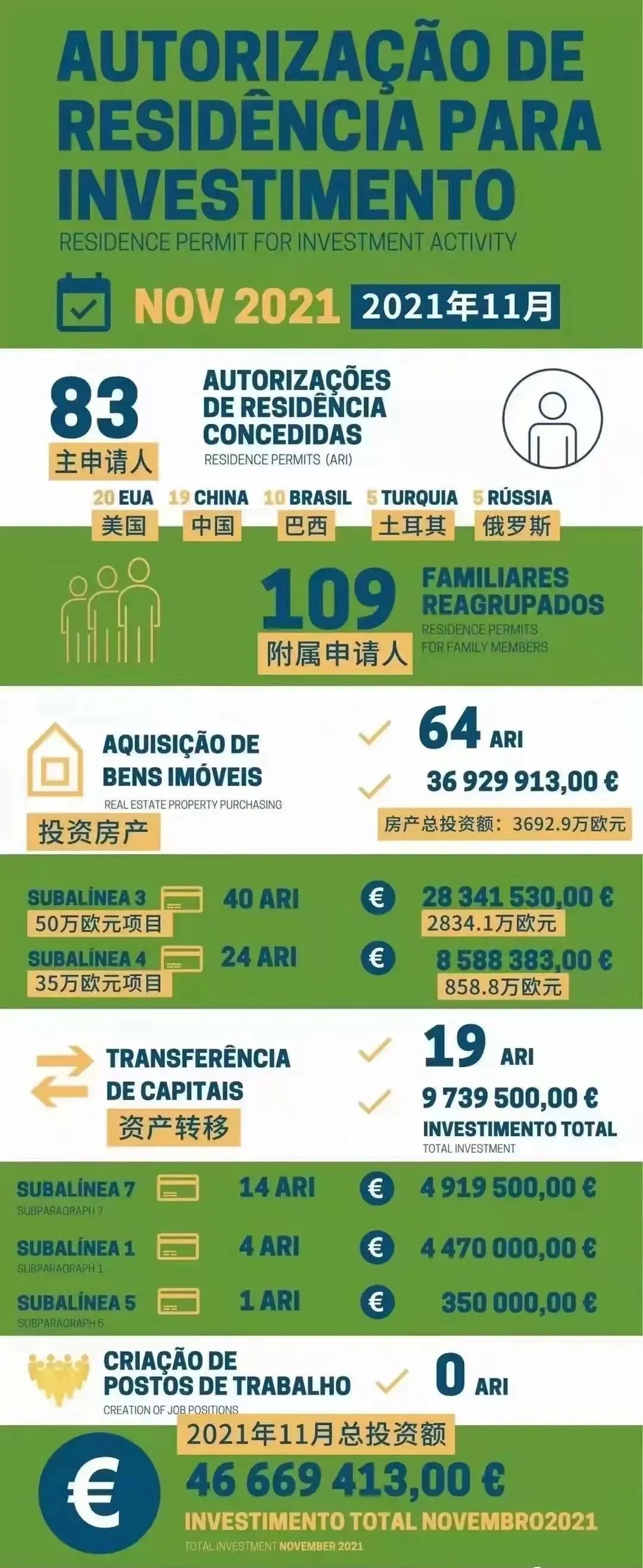 近日,葡萄牙移民局(SEF)公布了2021年11月份的黄金签证数据。2021年11月份,共计有83位主申请人和109位附属申请获批葡萄牙黄金签证,投资额为4666万欧元。其中,来自美国的主申请人为20人,排名第一,其次是中国(19位)、巴西(10位)、土耳其(5位)、俄罗斯(5位)。这说明,越来越多的投资者意识到海外投资的重要性,不仅中国投资者,乃至全球投资者都对葡萄牙黄金签证项目展现出了极大兴趣。