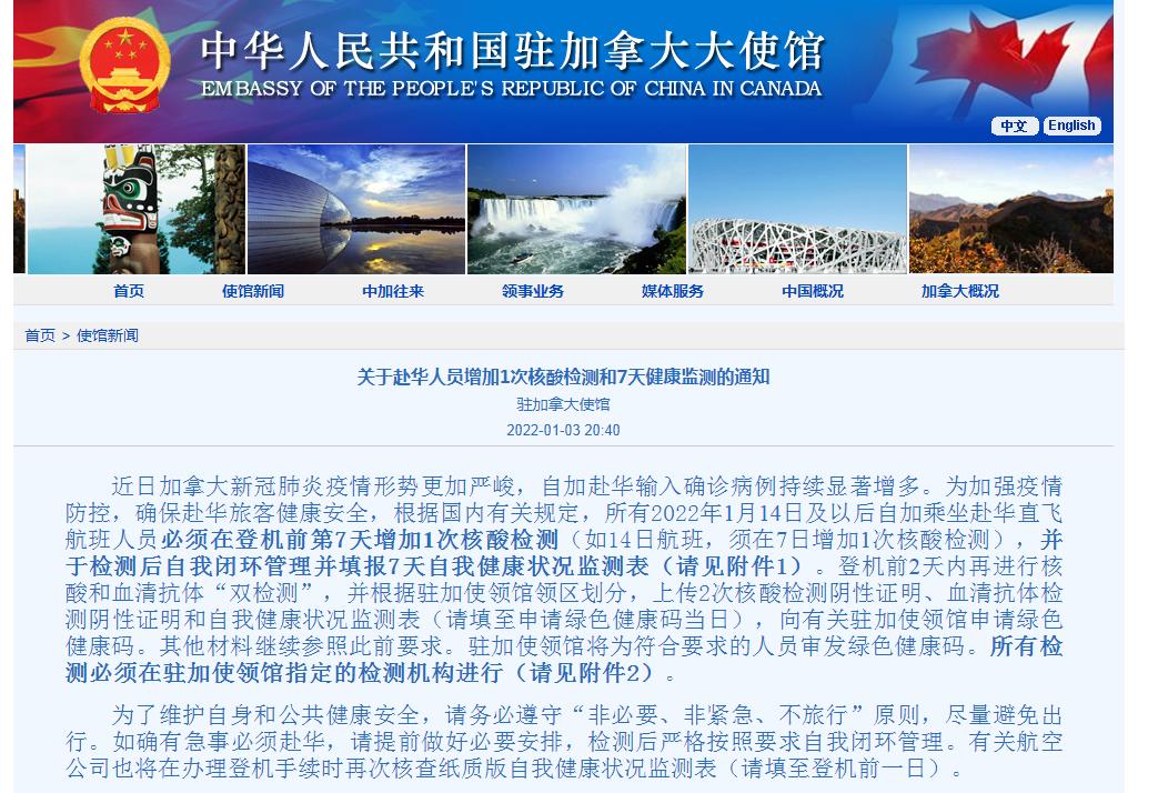 此外,近期有从加拿大回国计划的人士注意啦!2022年1月3日,中国驻加拿大大使馆颁布了最新通知!