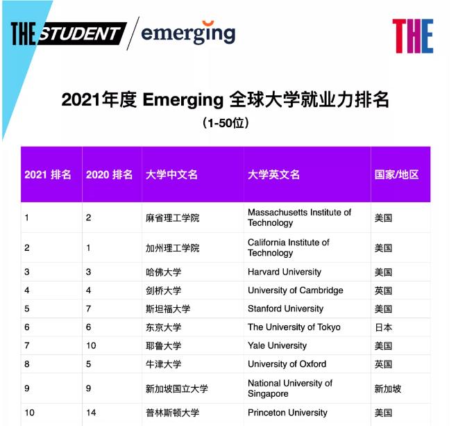 近日,泰晤士高等教育(THE)发布了2021年度全球大学就业力排名,本次排名共包括了250所大学。其中,TOP10里有6所是美国大学,麻省理工、加州理工、哈佛大学包揽前3;斯坦福、耶鲁、普利斯顿则分别位列第5、7、10。从总体数量来看,美国共有54所大学上榜,在入选数量和得分上都名列榜首,可见全球对其教育实力的广泛认可。