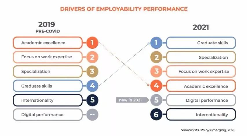 榜单还传达出一个重要信息,越来越多的雇主正在寻找具有专业技能的毕业生,而不仅仅关注他们就读的大学声望。如上图所示,在2019年即疫情之前,学术水平还在就业力表现中占最重要的因素。而在2021年,毕业生的技能已从第四位上升至首位,专业性与工作经验均已高于学术水平的重要性。