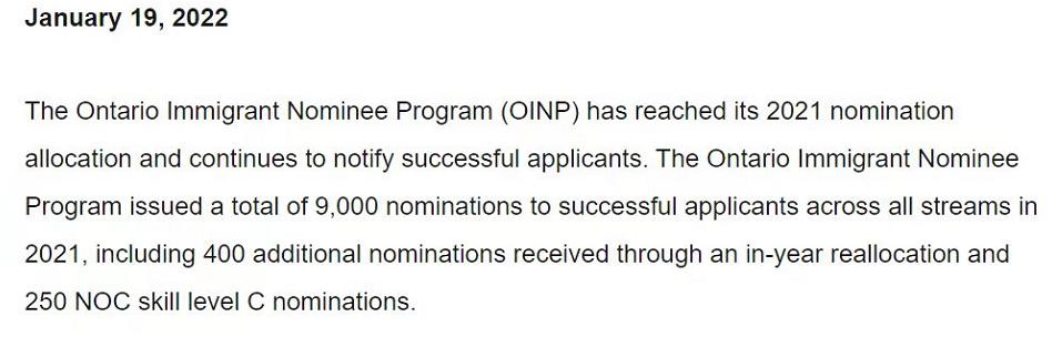 近日,加拿大安省移民局公布:“安省省提名计划(OINP)” 在2021年向所有类别的申请人共签发了9000份提名批准信,已超额完成2021年原定的省提名配额计划;多出的提名配额主要来自400个年度配额的重新分配以及250个NOC C 类提名配额。