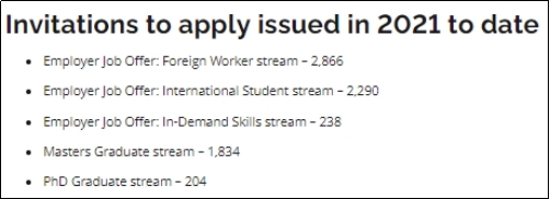 另外,2021年4月份,安省省提名计划(OINP)正式启动EOI入池筛选。2021年通过EOI系统实际发出的提名邀请累计7432份;其中安省雇主担保的“海外雇员”移民申请类别发出了高达2866份提名邀请,占比最高,达38.57%。