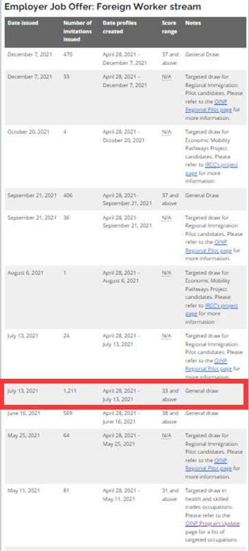 安省移民局2021全年度针对安省雇主担保“海外雇员”移民申请类别进行了稳定、高频次的EOI抽选。这些抽选包含针对“区域试点计划”、特定工种的定向抽选( Target Draw)和普通抽选(General Draw)。普通抽选一共进行了4次抽选,总共发出邀请2656份;其中2021年7月13号的抽选发出邀请最多达1211,筛选最低分仅为33分。