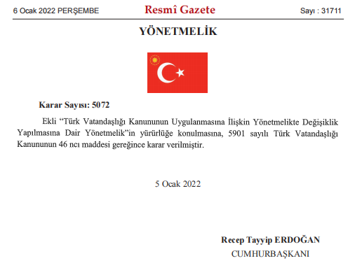 2022《土耳其公民法实施条例》修正案,主要内容如下: