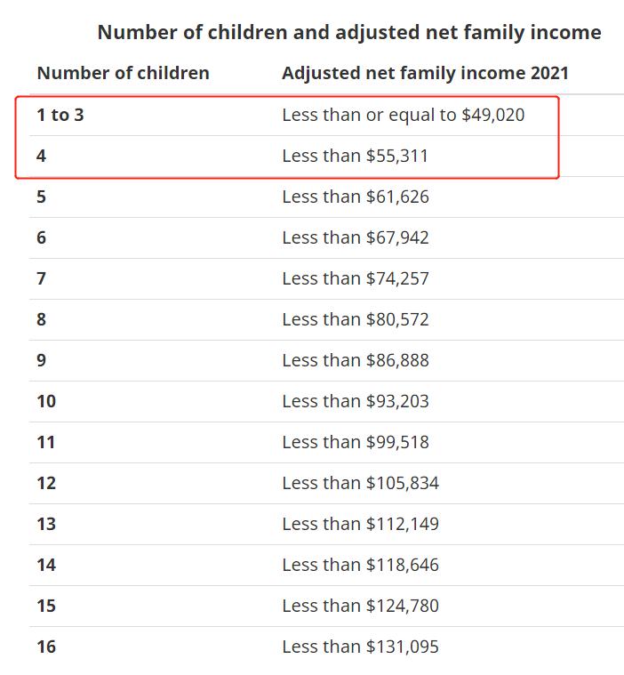 那么,所谓的低收入家庭的标准又该如何界定呢低收入家庭的标准参照联邦官网,如果一个家庭有1-3个孩子,那家庭的年收入不能超过49,020加元,4口之家家庭收入不能超过55,311加元。孩子的数量越多,年收入的标准也会逐步提高,具体可以参考下图: