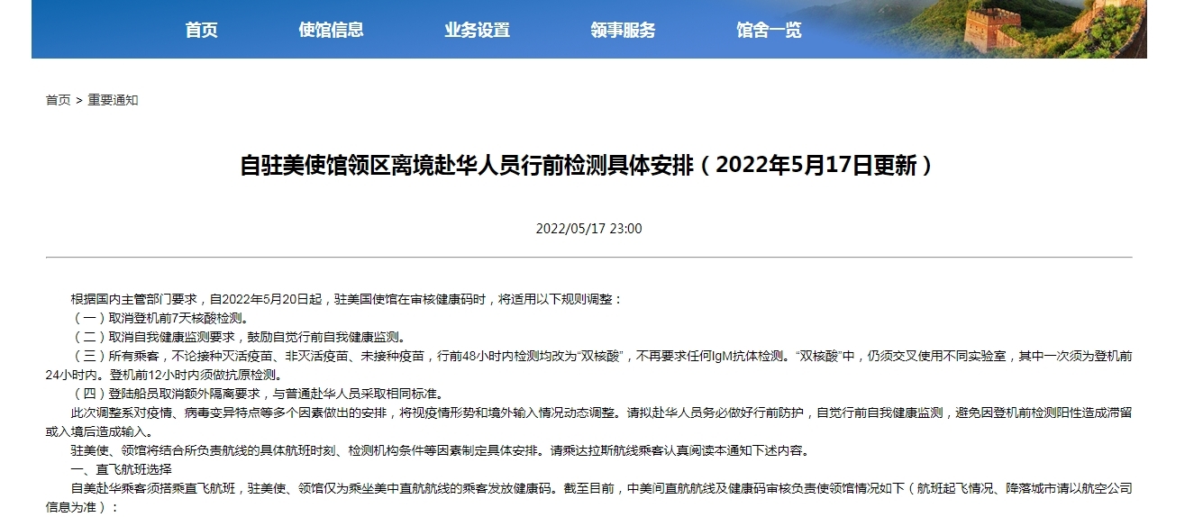 5月17日,中华人民共和国驻美利坚合众国大使馆官网发布了《自驻美使馆领区离境赴华人员行前检测具体安排》。根据国内主管部门要求,自2022年5月20日起,驻美国使馆在审核健康码时,将适用以下规则调整: