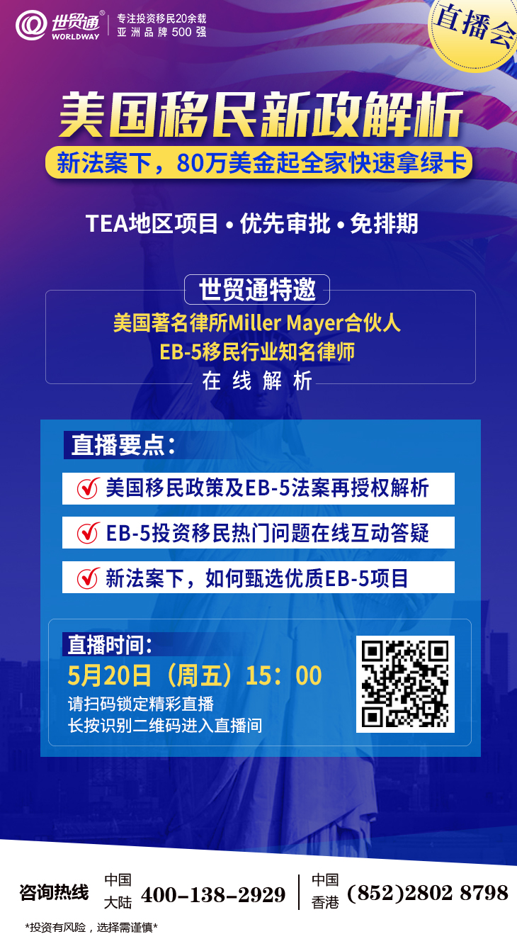 同时,5月20日(周五)15:00,世贸通特邀美国著名律所Miller Mayer合伙人、EB-5移民行业知名律师,为您在线解析美国移民最新政策及支招甄选优质EB-5项目的方法,分享成功案例,解疑答惑,请锁定“世贸通直播间”,别错过!