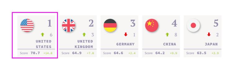 近日,全球品牌估值咨询公司Brand Finance发布了《2022年全球软实力指数排名》 ,其中,美国时隔1年重回榜首,相较于去年上升5名。