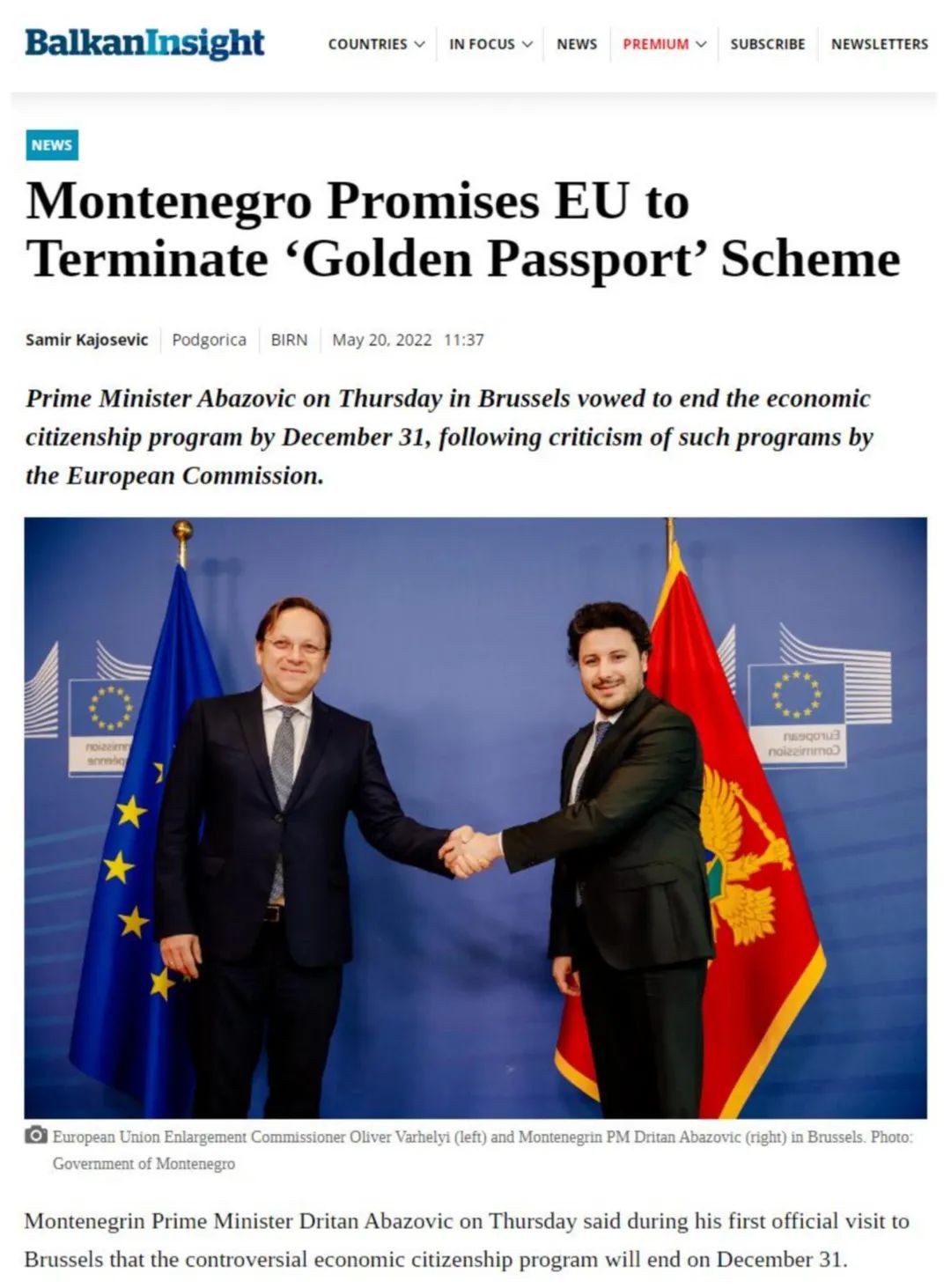 黑山投资入籍项目已经延期一年,今年到期后或将关停。近日,黑山新任总理Dritan Abazovic 在其第一次访问布鲁塞尔期间似乎承诺肯定要在年底前终结该国投资入籍计划。