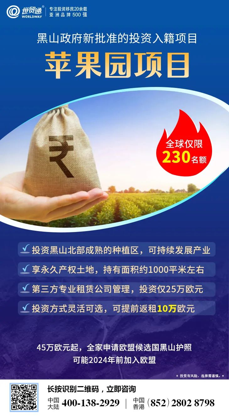重大好消息!世贸通集团向广大投资者隆重推介的——黑山政府新批准的投资入籍项目「苹果园项目」,位于黑山北部普列夫利亚市成熟的种植区,属于可持续发展产业。投资仅需25万欧元,可持有约1000 平米左右的永久产权的苹果园种植土地,苹果园开发种植时间最晚不超过2024年,投资方式灵活可选,可提前返租10万欧元。项目仅限230个投资名额,先到先得!