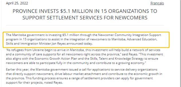 目前,曼省政府将向 Manitoba Start 这一公益组织提供300万加元的资金,用于帮助新移民定居、适应环境、提升语言水平和就业能力等。另外210万加元将投放于其他14个服务组织,包括家庭动力、曼省移民中心公司和新移民就业和教育发展服务公司。