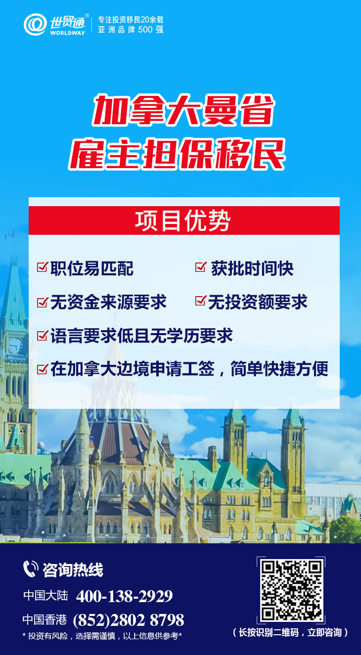 符合条件的申请人尽快行动吧,低门槛快速移民加拿大,就趁现在! !更多详情,请在评论区私信我们,或拨打世贸通服务热线,中国大陆:400-138-2929 ,中国香港:(852)2802 8798。
