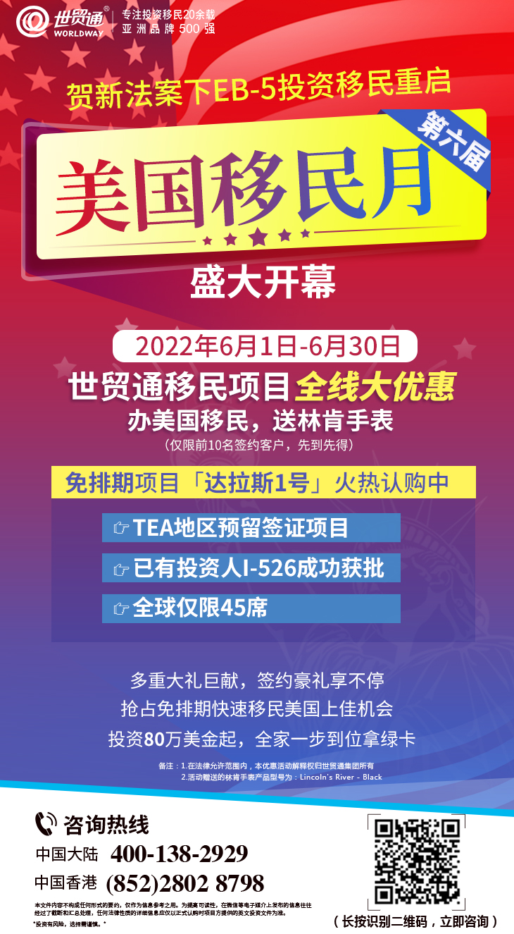 2022年6月,第六届美国移民月盛大开幕,世贸通移民项目全线大优惠,办美国移民,送林肯手表!多重大礼巨献,签约豪礼享不停!同时,世贸通将推广众多优质移民项目,同时举办涵盖教育、投资、税务、政策解析、移民等一系列丰富多彩的活动。
