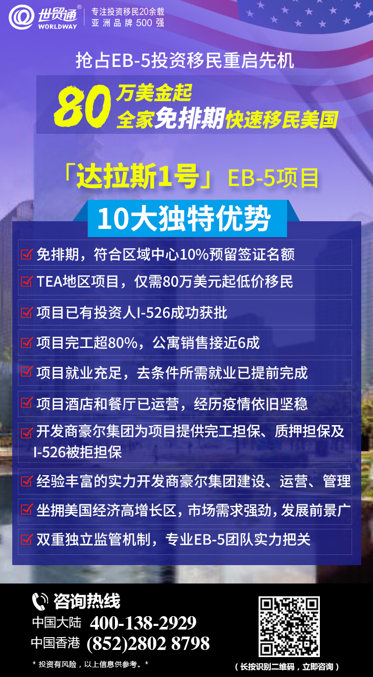 对于移民美国、布局子女教育有着明确需求的投资人应当赶快行动,尽早完成移民申请!达拉斯1号EB-5项目正是助力投资人成功移民美国的好选择。该项目作为市面上少有的符合区域中心(TEA)高失业率地区10%预留签证名额的EB-5项目,集合免排期、已有投资人I-526成功获批、去条件所需就业已超额完成等等诸多突出优势于一身,备受投资者的欢迎。