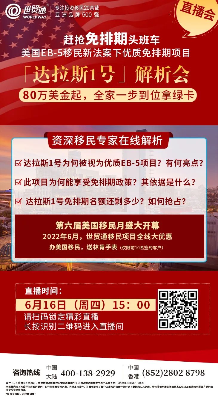 想要详细了解免排期达拉斯1号EB-5项目,请锁定世贸通直播间,6月16日(周四)15:00,世贸通特邀美国资深移民专家,在线为您全面解析EB-5移民新法案下优质免排期项目「达拉斯1号」,以及EB-5新法案下热点问题答疑,精彩别错过!