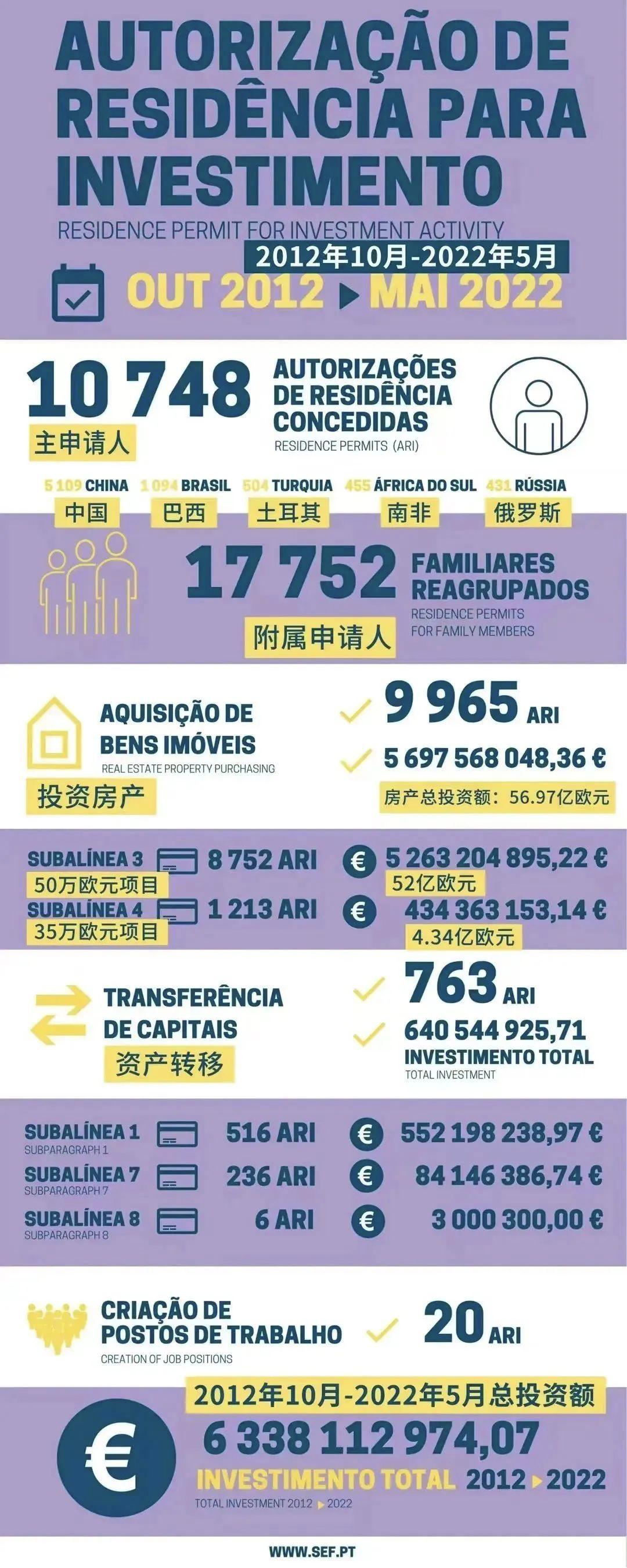 近日,葡萄牙移民局(SEF)公布了2022年5月份的黄金签证数据。2022年5月份,共计有112位主申请人和138位附属申请获批葡萄牙黄金签证,投资额为5380万欧元。其中,来自中国的主申请人为17人,排名位列首位,其次是美国(16人)、巴西(10人)、黎巴嫩(8人)、印度(7人)。