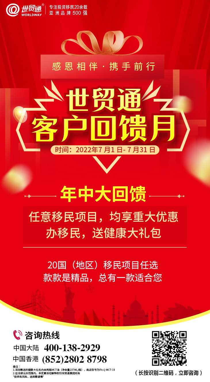 好项目不等人,对于有移民美国的刚性需求的投资者而言,切勿徘徊犹豫,早申请早受益,优先拿绿卡,开启人生的美国之旅。另外,为感谢广大新老客户对世贸通一直以来的信任和支持,世贸通特开展“客户回馈月”活动。2022年7月1日至7月31日,世贸通年中大回馈,任意移民项目,均享重大优惠,办移民,送健康大礼包,限时大回馈,办理需从速,欢迎您及您的亲朋好友咨询。更多详情,请在评论区私信我们,或拨打世贸通服务热线,中国大陆:400-138-2929 ,中国香港:(852)2802 8798。