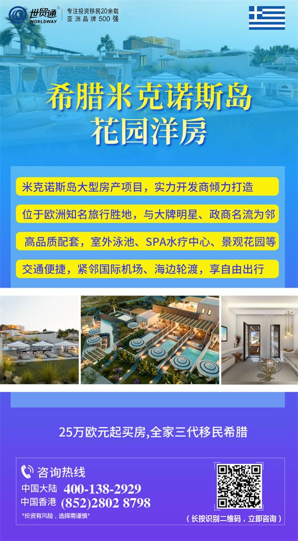 亚洲品牌500强世贸通集团,作为较早将希腊置业移民项目引入中国的移民机构,再次携手希腊实力开发商隆重向投资者推介又一重磅希腊买房移民项目——米克诺斯岛奢华花园洋房,出租自住两相宜。