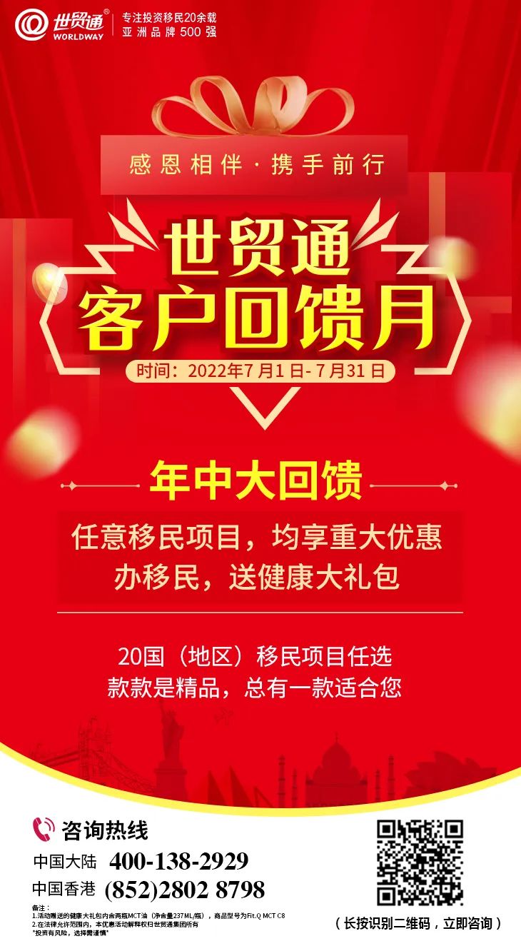 重大好消息!重大好消息!为感谢广大新老客户对世贸通一直以来的信任和支持,世贸通特开展“客户回馈月”活动。2022年7月1日至7月31日,世贸通年中大回馈,任意移民项目,均享重大优惠,办移民,送健康大礼包,限时大回馈,办理需从速,欢迎您及您的亲朋好友咨询。更多详情,请在评论区私信我们,或拨打世贸通服务热线,中国大陆:400-138-2929 ,中国香港:(852)2802 8798。