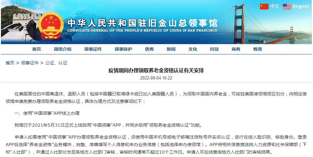 许多在美华人担心自己无法领取国内的养老金。近日,中国驻旧金山总领事馆发布了最新通知,针对养老金的资格及安排问题做出了相关解答。以下是旧金山领事馆通知原文。