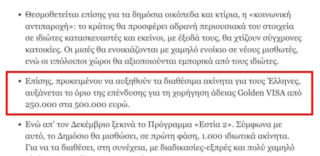 当地时间9月10日下午,希腊总理米佐塔基斯在第86届塞萨洛尼基国际博览会上宣布了21项措施,旨在缓解学生、老人和弱势群体的生活压力,以及帮助改善就业问题和刺激企业的发展。其中,一条重要的措施是:将希腊黄金签证的购房门槛由原来的25万欧元提升至50万欧元。
