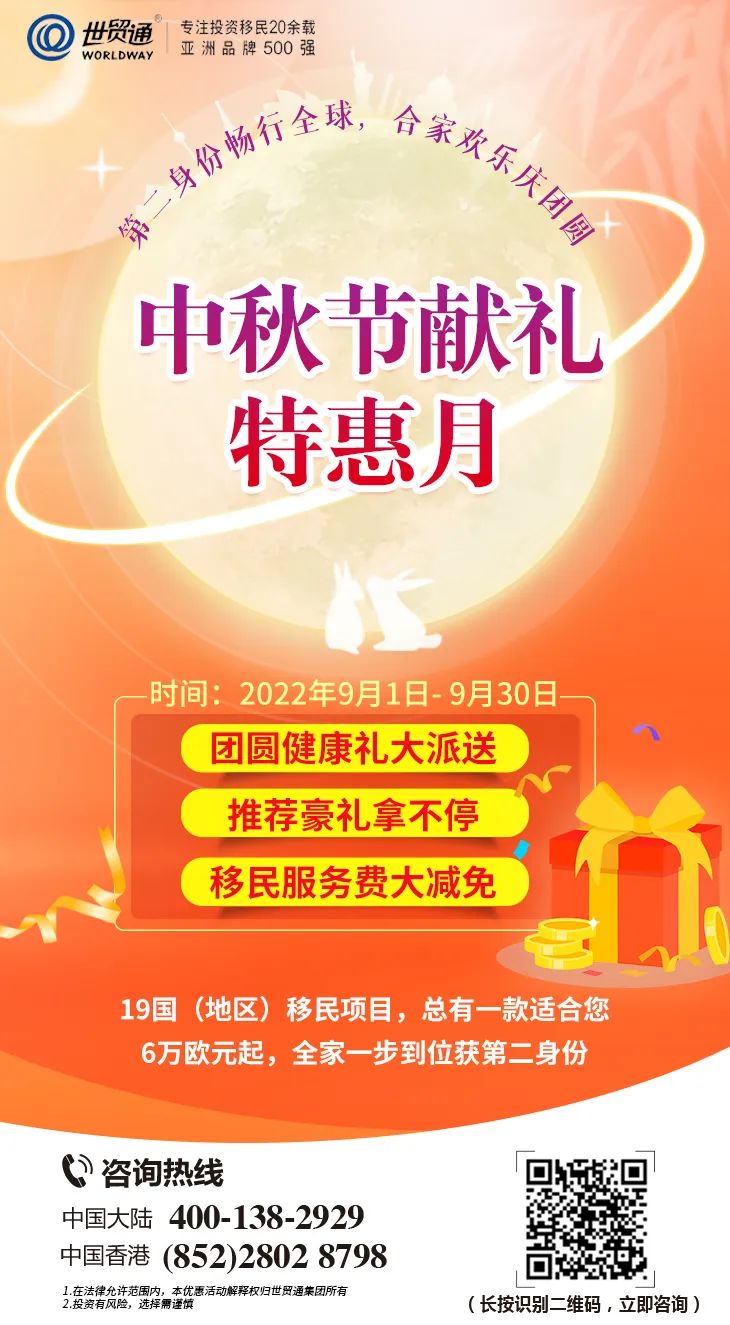 重大好消息!重大好消息!为感谢广大新老客户长期以来对世贸通的信任和支持,世贸通特开展“中秋节献礼•特惠月”活动。第二身份畅行全球,合家欢乐庆团圆,2022年9月1日至 9月30日,团圆健康礼大派送,推荐豪礼拿不停,移民服务费大减免。19国(地区)移民项目,总有一款适合您,6万欧元起,全家一步到位获第二身份,限时大优惠,良机不容错过!