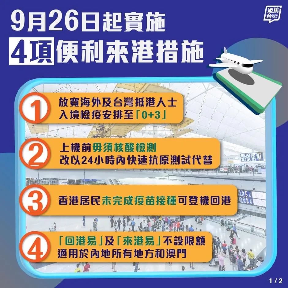 由香港时间2022年9月26日上午6时起,从海外或台湾经机场抵港人士无须在酒店接受检疫,三日酒店检疫加四日居家医学监察的「3+4」抵港检疫安排会改为三日居家医学监察的「0+3」安排,并同时实施其他便利旅客来港的措施。