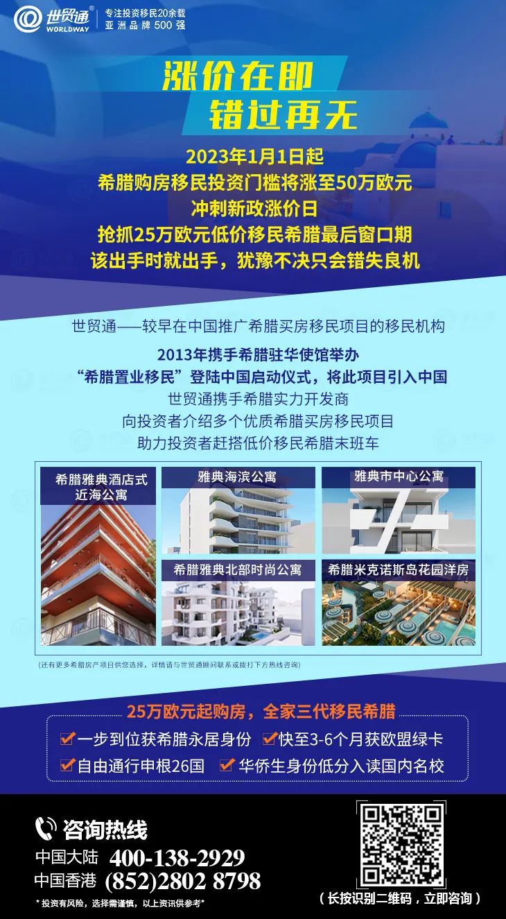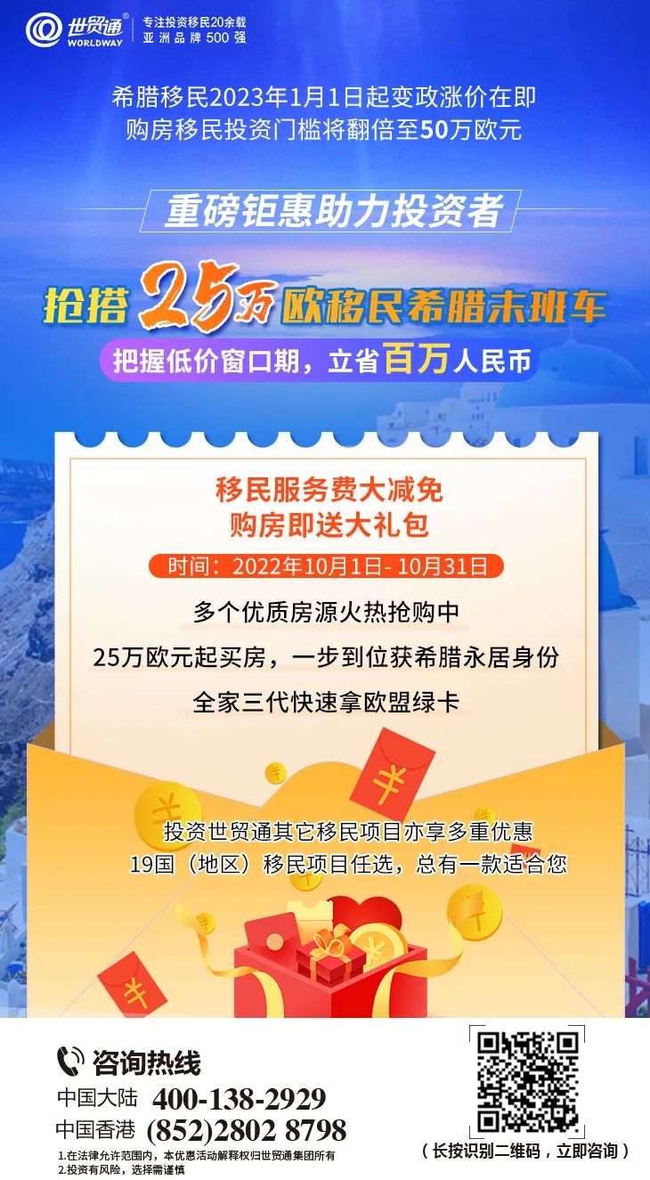 希腊购房移民变政涨价在即,抓紧时间上车,再不行动真的来不及了!2022年10月,重磅钜惠助力投资者抢搭25万欧移民希腊末班车,把握低价窗口期,立省百万人民币。投资世贸通其它移民项目亦享多重优惠,19国(地区)移民项目任选,总有一款适合您。