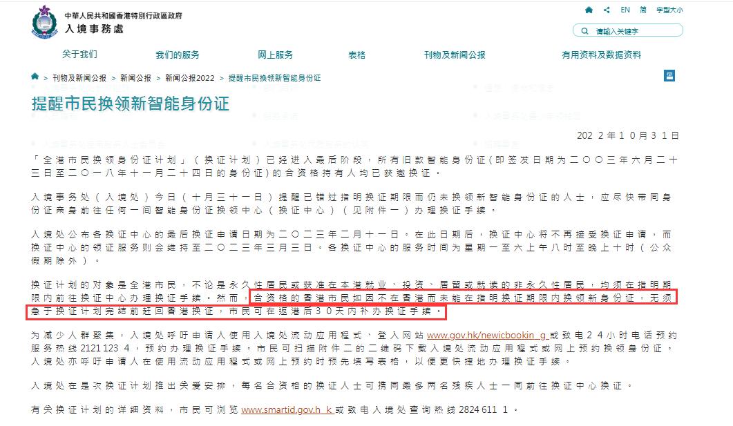 根据通知,对于身在内地的香港移民而言,未能在限期内换领新身份证也不用担心。即使回港时已过了指明限期,只须在返港的30天内前往任何一间智能身份证换领中心补办手续即可。