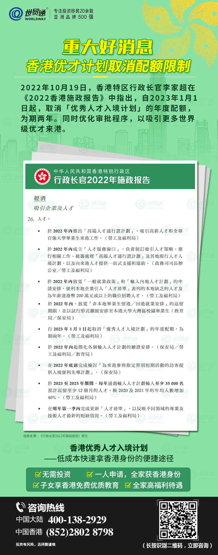 作为快速获取香港身份便捷途径之一的香港优秀人才入境计划,自2006年推出以来,就备受移民申请者的欢迎,其配额从1000增加到2000,再增加至4000。2022年10月19日,香港特区行政长官李家超在《2022香港施政报告》中指出,自2023年1月1日起,取消「优秀人才入境计划」的年度配额,为期两年。同时优化审批程序,以吸引更多世界级优才来港。这对投资者而言,可谓是一大好消息。