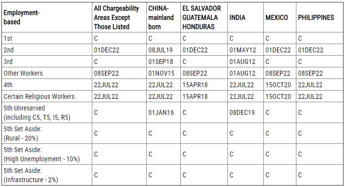 B表:Dates For Filing Of Employment-Based Visa Applications