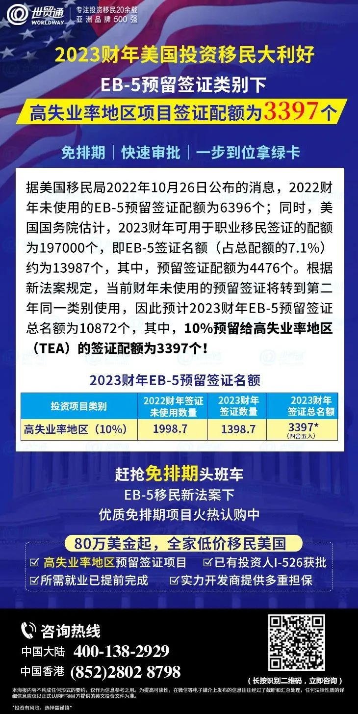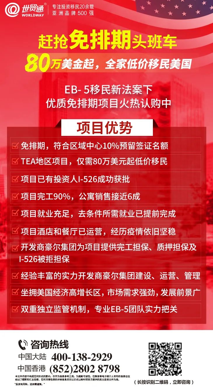 值得注意的是,EB-5签证预留类别(乡村地区项目预留签证20%、高失业率地区项目预留签证10%、基建项目预留签证2%),目前是继续无排期状态。有意向移民美国的申请人,赶紧上车,继续赶抢免排期头班车,快速获得美国绿卡!