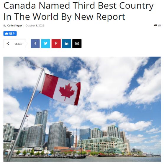 近日,“2022年全球最佳国家排行榜”(Best countries)出炉,在全球85个国家中,加拿大高居第三。