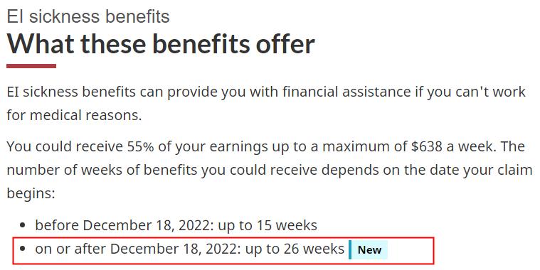 EI疾病福利向申领人每周可获得其收入的55%,最高638加元。从12月18日开始,申请EI的人士将有资格获得更优厚的福利,相当于比原来多领11周的福利,或多领7018元。可领取的最高金额,将从9570加元增加至16588加元!