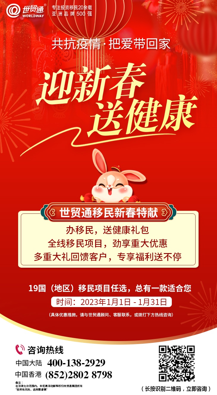 重大好消息!为感谢广大新老客户多年来对我们的信任与支持,2023年1月,世贸通特开展“迎新春送健康”活动。办移民就送健康礼包,共抗疫情·把爱带回家!全线移民项目,劲享重大优惠,多重大礼回馈客户,专享福利送不停,19国(地区)移民项目任选,总有一款适合您。机会难得,不容错过!限时大回馈,办理从速!