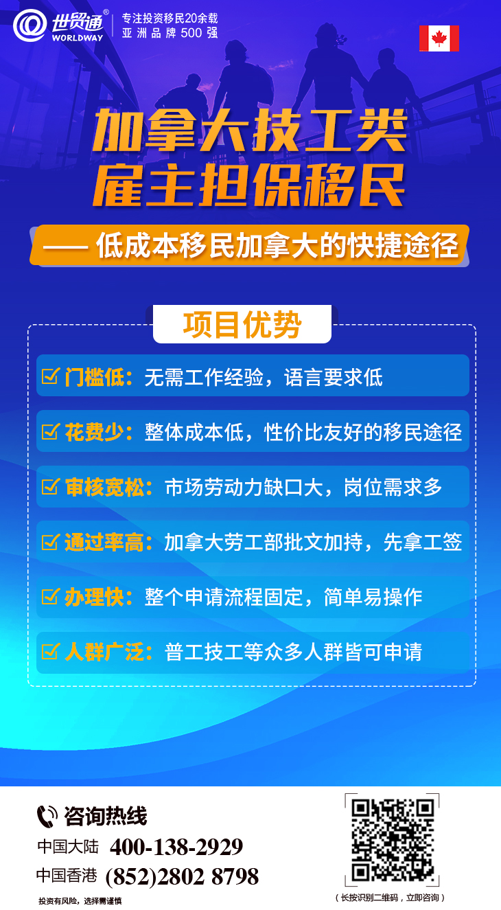 如果您想移民加拿大,加拿大技工类雇主担保移民是不错的选择!加拿大技工类雇主担保移民申请门槛低,审核非常宽松,没有投资额要求,对申请人没有岗位工作经验要求,语言、学历要求也较低。并且,整体申请成本低,是性价比非常友好的移民途径,申请流程简单易操作,通过率高!