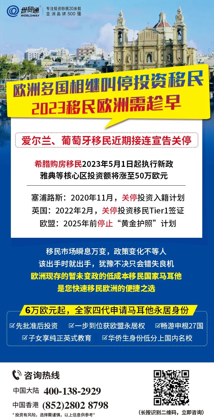 亚洲品牌500强世贸通集团,专注投资移民20余载,作为欧洲投资移民项目的积极推动者,多年来一直与葡萄牙、希腊、马耳他等国家政府保持良好互动,是您办理欧洲国家移民的上佳之选。更多详情,请拨打世贸通服务热线,中国大陆:400-138-2929 中国香港:(852) 2802 8798。