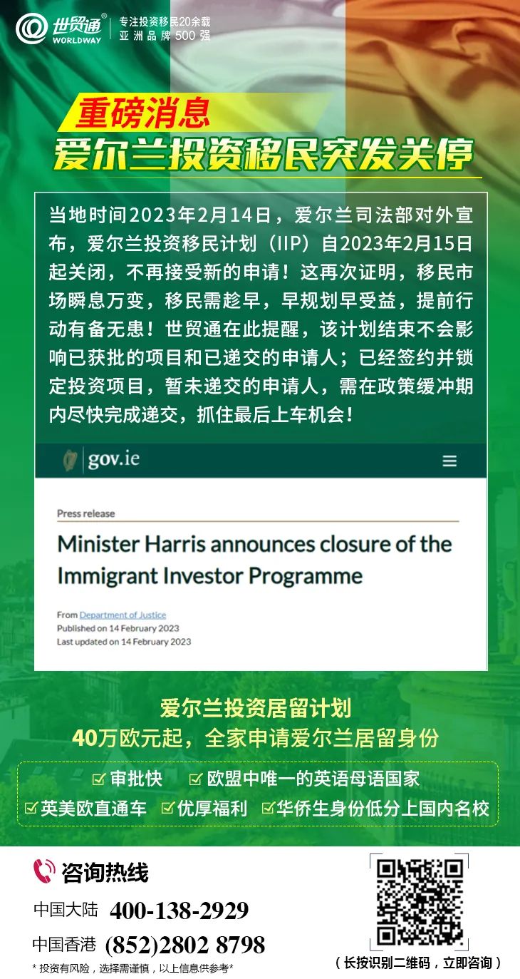 近日,欧洲各国移民计划相继变政。2023年2月15日起,爱尔兰投资移民计划关停;2023年2月16日,葡萄牙总理宣布将终结黄金居留政策;据悉,西班牙政党也提出关闭置业投资移民项目。