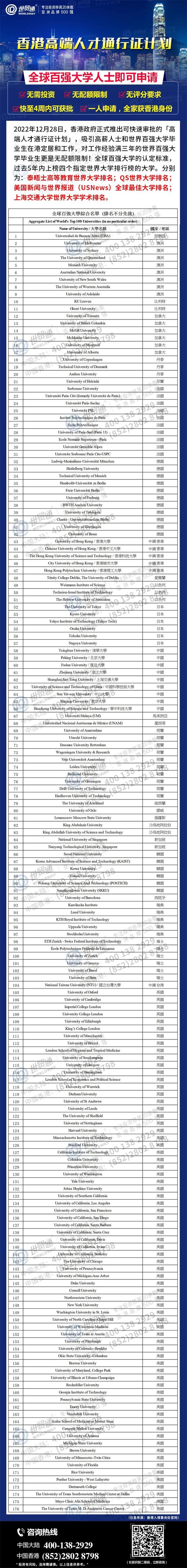 以上就是香港高才计划B类和C类认可的全球所有百强大学名单,一共176所院校,换一个角度来说这一份官方名单更是展示了这些学校的认可度和含金量。