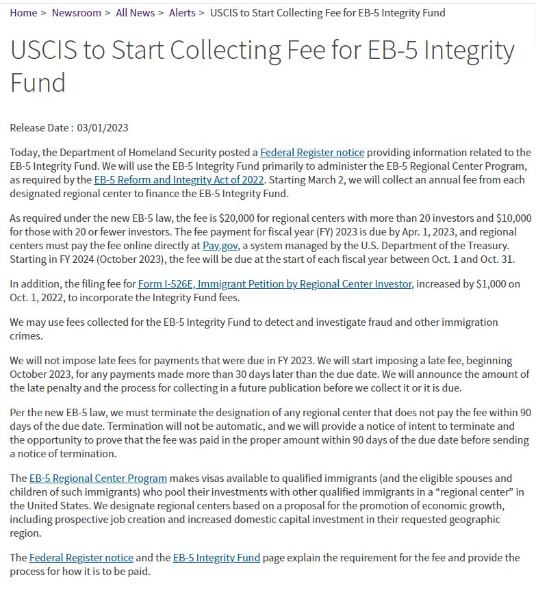 当地时间3月1日,美国国土安全部(DHS)发布了一份联邦公报通知,提供了EB-5诚信基金的相关信息。根据2022年EB-5改革与诚信法案的要求,美国移民局(USCIS)将使用EB-5诚信基金来管理EB-5区域中心计划。