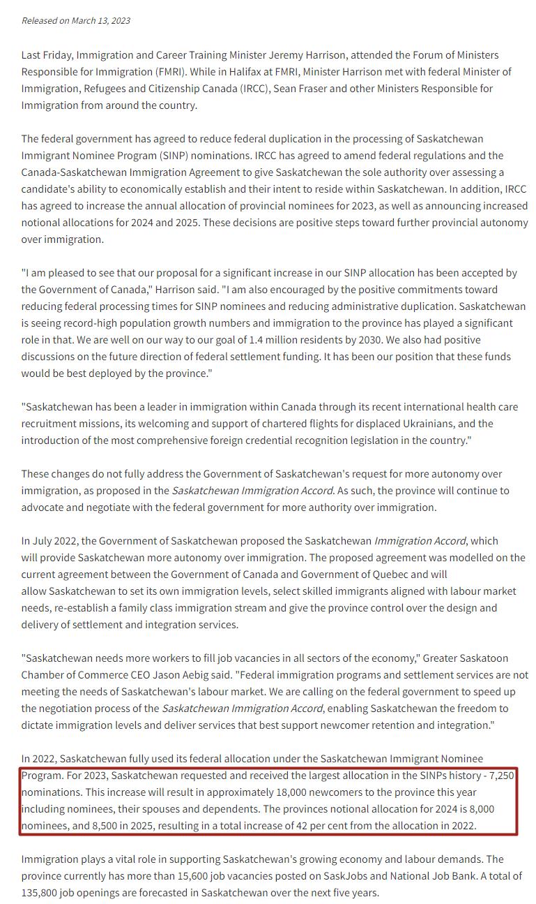 连续三年逐年递增,可见萨省在吸纳移民上的决心。同时,萨斯喀彻温省正在经历创纪录的人口增长,并正在朝着到2030年达到140万居民的目标前进。另外,萨省官方表示,加拿大联邦政府已同意减少处理萨省省提名计划的重复工作以提高审批效率。