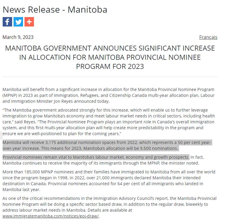 曼省移民部长指出,“省提名计划在加拿大的整个移民系统中发挥着重要作用,曼尼托巴省政府强烈支持配额增加,这将使曼省能够进一步吸引移民来发展省内的经济。”据2022年数据显示,有超过2.1万人将曼省作为其移民加拿大的目的地,所有登陆的新移民中,省提名类移民占64%。