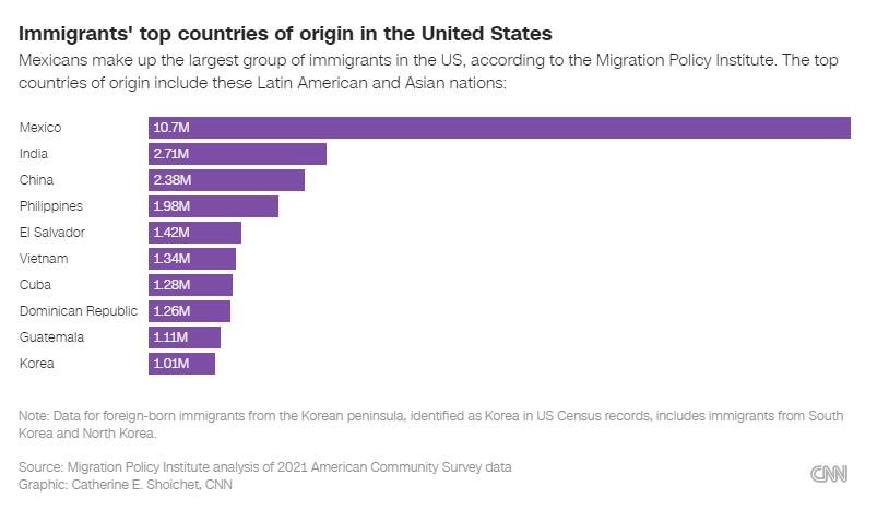 这些统计数据既包括合法进入美国的移民,也包括无证移民。根据数据,墨西哥人是美国最大的移民群体。但十多年来,居住在美国的墨西哥移民总数一直在下降。据估计,2021年有1070万墨西哥移民居住在美国,比10年前减少了大约100万。与此同时,数据显示,来自中国等其他国家的移民人数一直在上升。